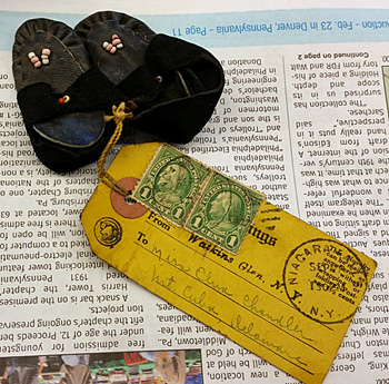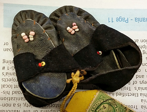 The tiny moccasins were both cute and crude, but I was drawn to them by the bright yellow tag hanging off them. The moccasins had been mailed unwrapped to a woman in Delaware, and I found that surprising.
