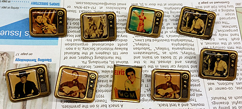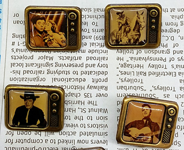 There were nine of them, all in the shape of a screen and dial on a teeny tiny TV set. Each bore laminated images of several stars that I recognized: Elvis as an MGM movie star and singer, “The Lone Ranger” with Clayton Moore, “The Honeymooners” with Jackie Gleason and Audrey Meadows, Roy Rogers and Trigger, “I Dream of Jeannie” with Barbara Eden and Richard Boone as Paladin in “Have Gun Will Travel.”