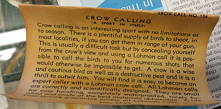 The staffer removed the calls from the glass case and laid them on top of the counter. He unrolled a small yellow sheet of paper accompanying them, and that’s when we both learned what these really were. Not duck calls but crow calls.