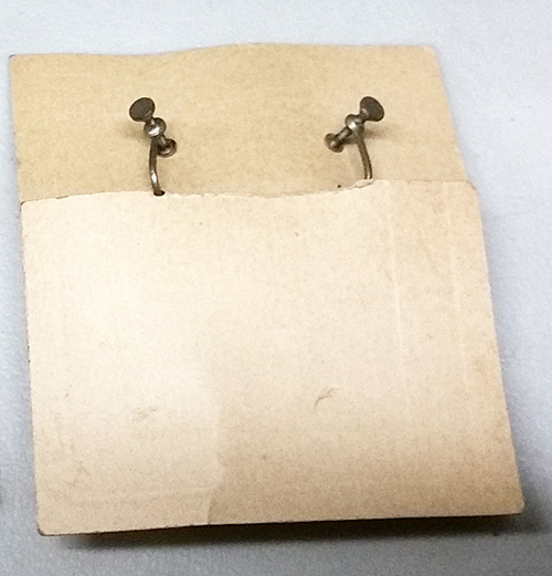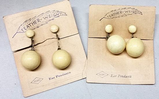 I was at an auction over the weekend where I came across several pairs of screw-backs in the shape of tiny balls. They were still on their original cardboard imprinted with the manufacturer’s name “NEMO” and the word “Featherweight.”