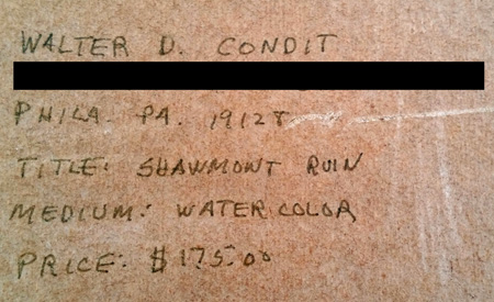 On the back of the painting, I found an inscription, presumably written by the artist, that included the title: “Shawmont Ruin.” Shawmont was the name of the street where the house was located. Missing, however, was the year it was painted, which had to be before April 1991 because that was the year that Condit died.