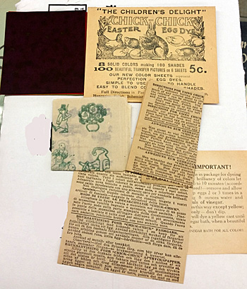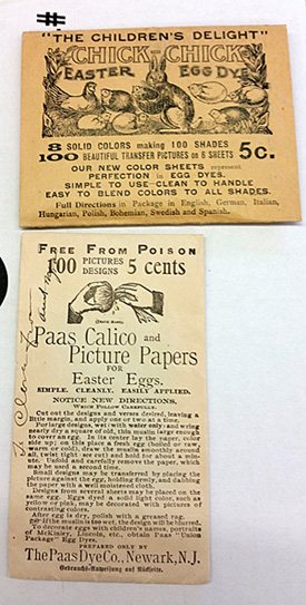 At auction recently, I came across two packets of Easter egg dye in plain wrapping. The style of print on the packets – and their lack of color – told me that these were not made yesterday but long ago. One bore the familiar name of Paas, the same dye kit that I remembered from my own childhood. But this one contained transfer sheets to decorate the eggs.
