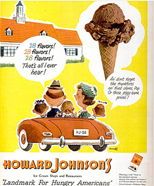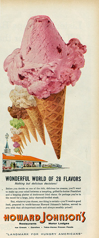 I don’t have any young memories of eating a vanilla ice cream cone from the 28 flavors at Howard Johnson’s. My family could never afford to eat there or drop by for a bite on travels we never took.