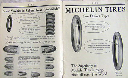 Coincidentally, I was cataloging some magazines, papers and documents from my auction visits over the years, and was thumbing through the April 11, 1912, Life magazine when I came across Michelin tires again. Car tires back then were the shape of bicycle tires, and didn’t seem to be much larger or sturdier. How on earth they held up the heavy Locomobile or Overland or Speedwell or Peerless cars advertised in the magazine was a mystery.