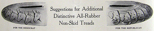 “These tires would be easy to sell, though they wouldn’t prevent skidding … . Think of the advertising value of a trail in the road indicating your vocation,” the ad said. “These distinctive treads would not prevent a sale if a republican, for example, wished to sell his car to a democrat, or vice versa. Just drive a few hundred miles and the designs will disappear as all-rubber non-skid designs do. These designs are not copyrighted – all manufacturers are welcome to adopt them.”