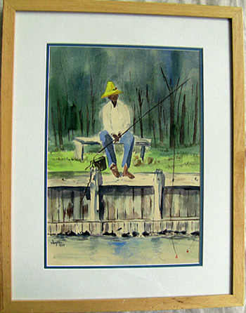 I thought of my uncle recently when I saw a picture of a waiting-to-be-sold painting on an auction-house website. When the day came for the auction I eagerly sought out the painting. It was a watercolor of an old man in a straw hat sitting on a dock with a fishing pole in the water and a bucket of bait near his feet. That’s exactly how I pictured my uncle. I could not decipher the artist’s name in the lower left corner, but did see that the watercolor was painted in 1975.