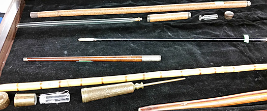 That’s a rare one, the auctioneer said as I stooped to peek inside a glass case of what looked like miniature wands. He was motioning to a short walnut stick with silver end-pieces lying among others of its size in the case.