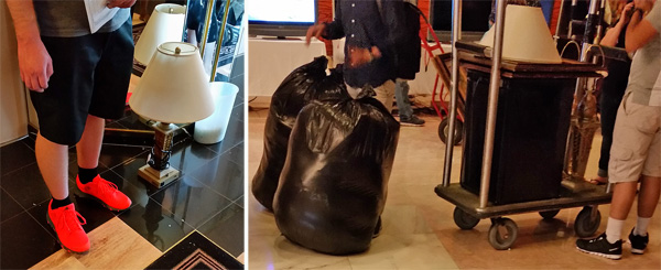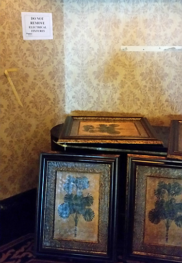 In one hallway were store-bought prints stacked against a table under a sign warning buyers not to remove electrical fixtures. The prints were popular, though, because I saw several people carrying them, sometimes more than one. Folks were also carrying small items such as lamps from floor to floor. A man on the elevator had snagged an electric fireplace from one of the luxury suites for $85.