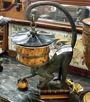 The lamp was a bronze textured monkey with its right hand on a ball and the rest of its body on a stack of books. Its curved tail at the top held the lamp itself. It had an interesting base, but the shade was the prize.