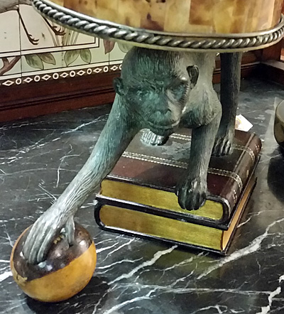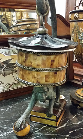 The company website described it as a “Verdigris Bronze Patina Monkey Lamp, Leather Book Design Base, Penshell Shade.” There was no price attached to it there, but I found the lamp selling for $1,000 to $2,000 and more on other retail sites. Verdigris refers to the green patina you see on bronze, and pen shell, to a clam of the same name.