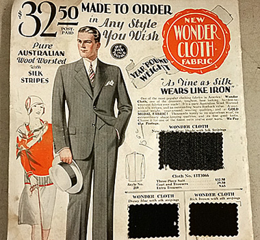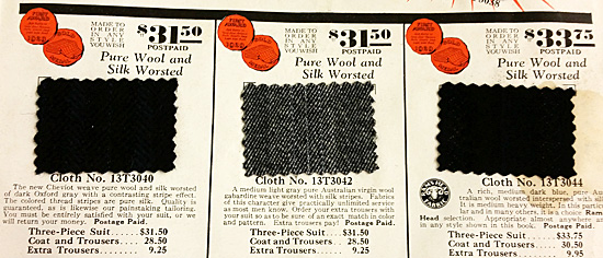 Most interesting about the catalog were the small rectangles of fabric swatches that men – or their women – could see and feel in making their decision: Should it be the Wonder Cloth “As fine as silk, Wears like iron,” “Pure Australian Worsted with Silk Stripes.” Or the “Pure Virgin Wool Worsted.”