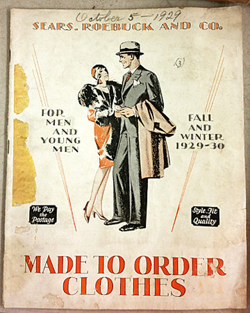 At auction recently, I came across a Sears Made-To-Order Clothes catalog for men and young men, Fall and Winter, 1929-30. It contained black and white photos – with splashes of orange – of dapper men in Sears suits and overcoats whose designs the buyers chose and Sears made. The orders were shipped for free.