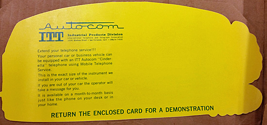 The words “ITT Autocom” were stamped in red on the front, sandwiched between two knobs. Laying next to the phone was a bright yellow card promoting a “Cinderella” mobile telephone for your car.