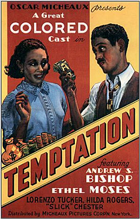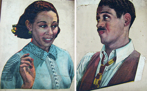 The woman with the raised hand and the man in the tie were from a poster for the 1935 film “Temptation” with Ethel Moses and Andrew S. Bishop.