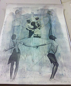 There were nine magic marker and crayon drawings by Wilkie, and what looked like an early sculpture (he later sculpted using laminated wood). His family had also included pieces from his collection, including a drawing by famed artist Elizabeth Catlett.