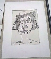 When the bidding started on Wilkie’s own artwork, I knew the one that I would go after. It was a magic marker drawing of a woman’s face, and it resembled the style of Picasso (who influenced him, according to his son David Raine) but was just as much Wilkie’s interpretation of the geometry of African carvings (another influence). You can just about see the shapes in the woman’s face.