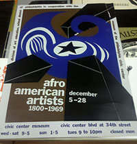 One of the interesting flyers was from a 1969 juried exhibit by the Philadelphia School District and the Museum of the Philadelphia Civic Center. The exhibit was called “Afro American Artists 1800-1969.” It included more than 100 artists, including Wilkie, Alvin Hollingsworth, Reginald Gammon and Louis Sloan. (Poster is shown at right.)